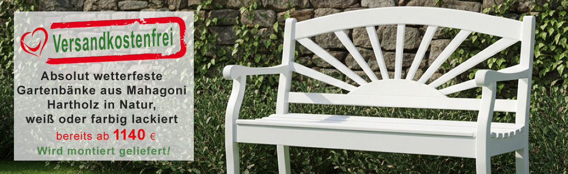 Wir fertigen unsere wetterfesten massiv Holz Gartenbänke und Sylter Friesenbänke in allen Arbeitsschritten nach Auftragseingang selber her. Das Kernholz, welches wir verarbeiten kommt als Stammware, die Herstellung einer Gartenbank oder Friesenbank und das Lackieren erfolgt komplett in unserer Werkstatt. Sägen, Schleifen, der Zusammenbau (Dübeltechnik und Verleimung) das Versiegeln, die 4-fach Lackierung von Gartenmöbel in Tauch- und Spritzverfahren und dazwischen die Trocknungsphasen und Zwischenschliffe der Sitzbänke, Holzbänke bis hin zum Verpacken und versenden, dauert seine Zeit. Im Gartenbank-Shop bekommen Sie Ihre neue Gartenbank Holz aus dem hochwertigen Sipo Mahagoniholz, Accoya Holz und Teakholz. Jede Gartenbank egal ob Gartenbank Holz weiß, Gartenbank Natur unbehandelt, Gartenbank grün und weitere RAL-Farben erhalten Sie von uns fertig montiert geliefert!
